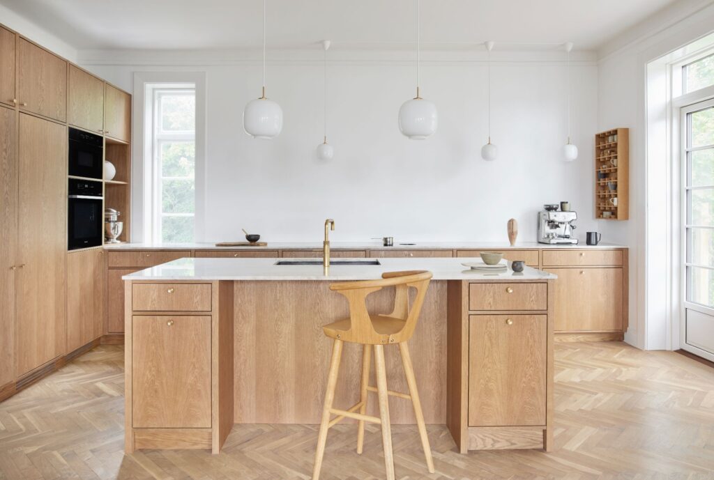 En marmorplade som Calacatta Viola eller Fior di Bosco ligger silkeblød over grebsløse skuffer, mens natursten, såsom Jura Grau og den subtile Emperador Light, blandt mange muligheder, står for slidstyrke og tidløshed. Hver eneste overflade patinerer elegant og bliver til et levende billede på hjemmets historie – præcis som egetræets naturlige årer, der ældes med ynde over årene.